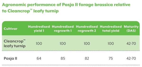 Cleancrop™ leafy turnip is a fast-establishing, multi-graze variety with reduced flower bolting and 25% more total yield from multiple grazings than Pasja II leafy turnip. As part of the Cleancrop Brassica System, it the added benefit of an herbicide tolerance trait allowing Telar® herbicide to be applied at both pre- and post-emergence for excellent weed control.