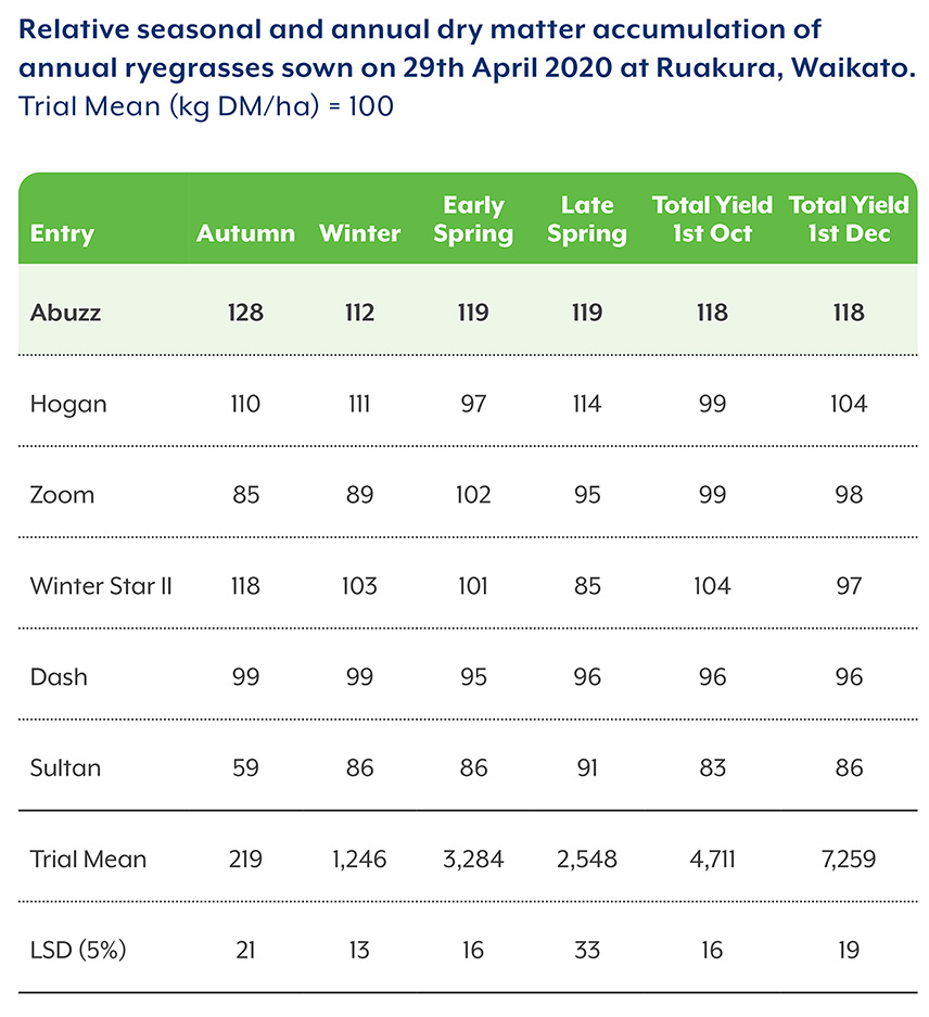 Sown on the 29th of April 2020 at Ruakura, Abuzz produced the greatest dry matter yield over the trial period from autumn to late spring compared to Hogan, Zoom, Dash and Sultan varieties.
