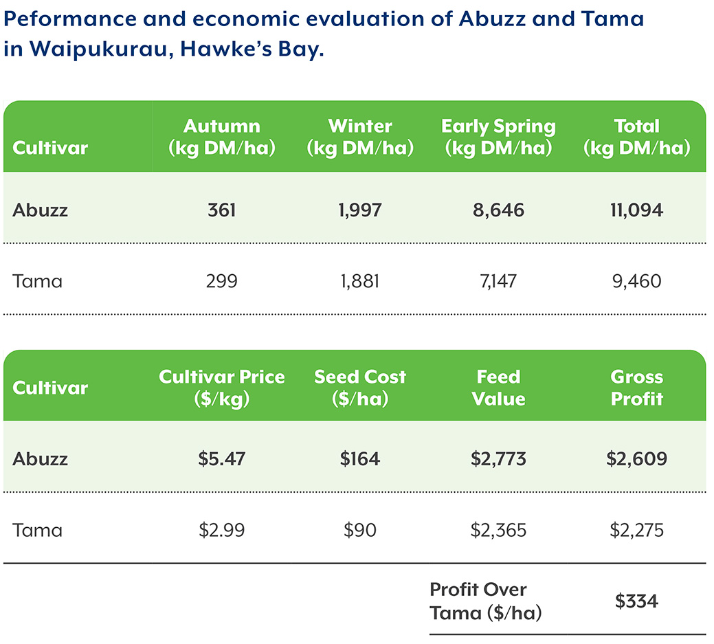 An economic comparison between varieties showed the value of Abuzz on farm. After differences in seed cost and dry matter production were accounted for Abuzz produced an economic advantage of $334/ha over Tama annual ryegrass.