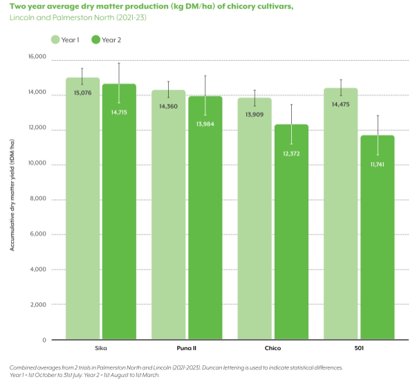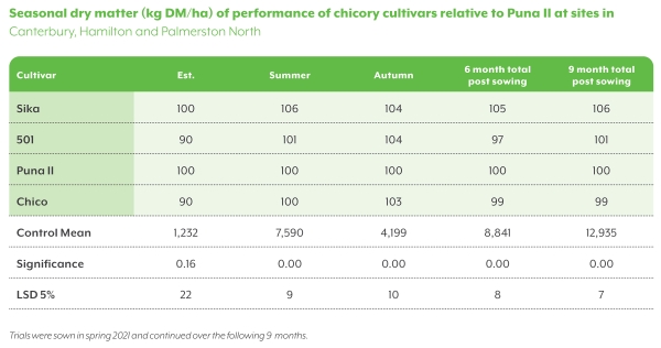 Sika chicory was tested at three key sites – Canterbury, Hamilton and Palmerston North. It was tested for its performance as an annual chicory to replicate usage from a spring sowing and feed over the summer/ autumn months (table 1). Sika consistently performed well against Puna II across all three sites. The results from these trials demonstrate that Sika has annual performance ideally suited to supplementing milking cows or growing out or finishing young stock.